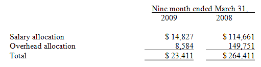 Salaries and employee benefits increased to approximately $299,700 in the nine months ended March 31, 2009 from approximately $239,000 in the nine months ended March 31, 2008, an increase of approximately $60,700. The increase is primarily attributable to the increased salary cost for our President who was employed for the full nine months in the period ended March 31, 2009 versus six in the year ago period.