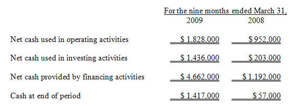 At March 31, 2009, we had working capital of $1,299,000, an increase from our negative working capital of $1,761,000 as of June 30, 2008. Our cash position increased significantly from June 30, 2008 as a result of the $4,580,000 of net proceeds we received from our private placement of common stock in August 2008.