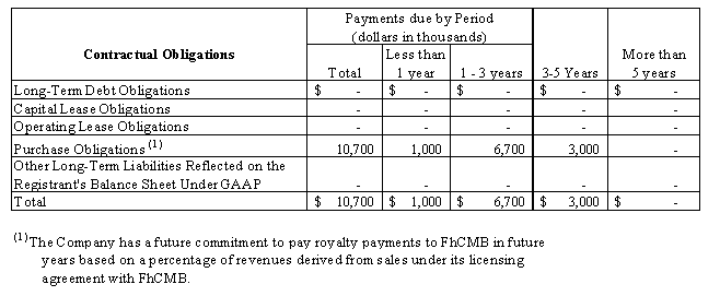 The following table sets forth the Company’s future commitments as of March 31, 2009 (Purchase Obligations represents our expected payments to FhCMB under our amended technology transfer and research agreements):