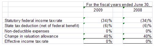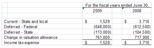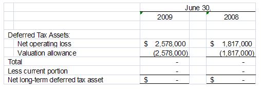 Deferred income taxes reflect the tax effects of temporary differences between the carrying amounts of assets and liabilities for financial accounting purposes and the amounts used for income tax reporting. Significant components of the Company’s deferred tax assets as of June 30, 2009 and 2008 follow: