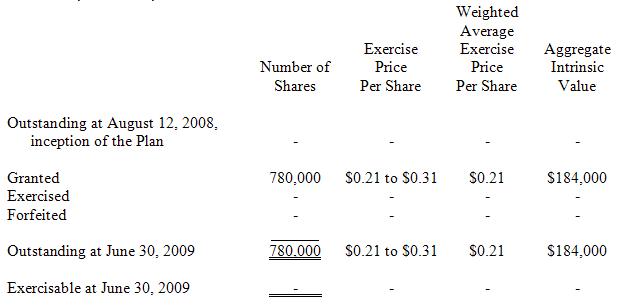 The following represents options outstanding for the period from August 12, 2008, the inception of the Plan, to June 30, 2009: