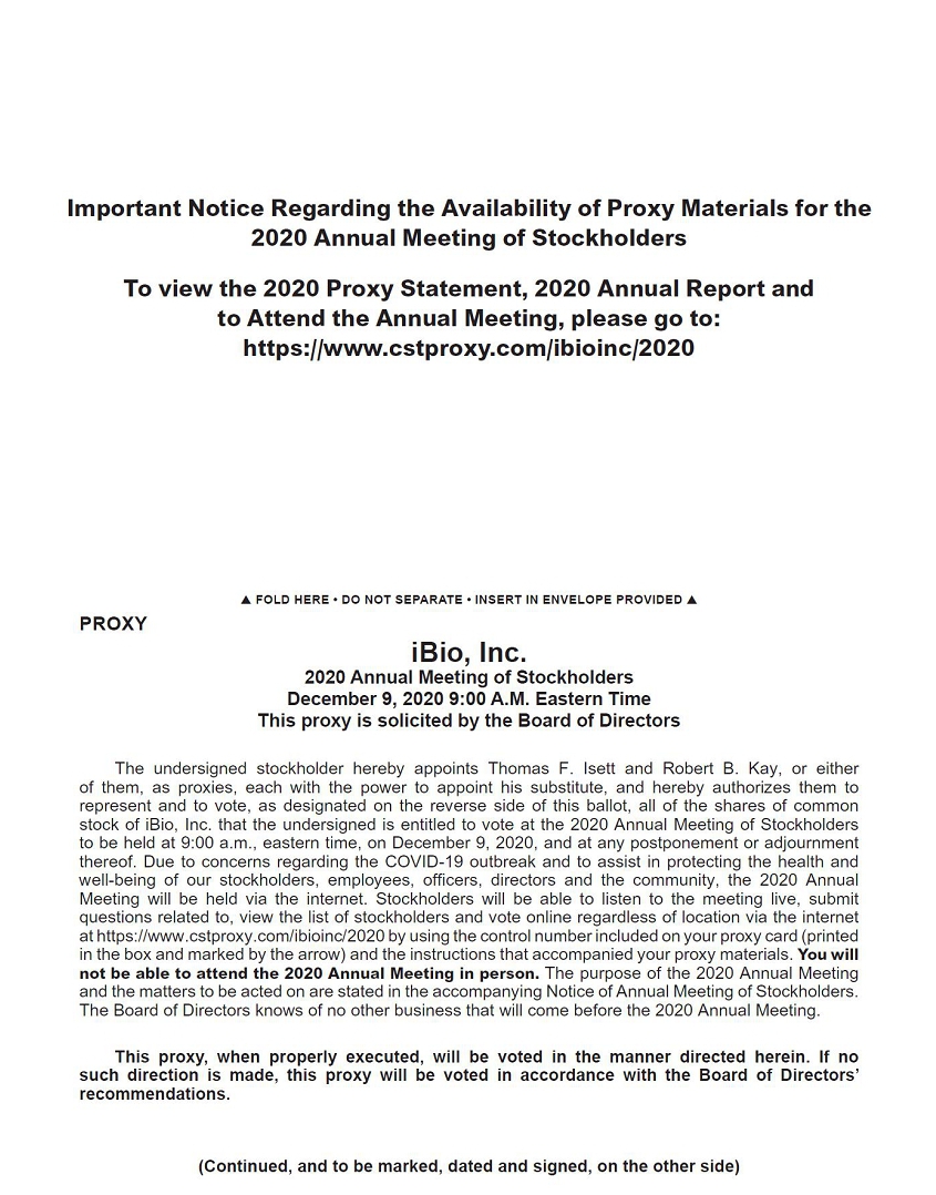 FOLD HERE • DO NOT SEPARATE • INSERT IN ENVELOPE PROVIDED PROXY The undersigned stockholder hereby appoints Thomas F. Isett and Robert B. Kay, or either of them, as proxies, each with the power to appoint his substitute, and hereby authorizes them to represent and to vote, as designated on the reverse side of this ballot, all of the shares of common stock of iBio, Inc. that the undersigned is entitled to vote at the 2020 Annual Meeting of Stockholders to be held at 9:00 a.m., eastern time, on December 9, 2020, and at any postponement or adjournment thereof. Due to concerns regarding the COVID-19 outbreak and to assist in protecting the health and well-being of our stockholders, employees, officers, directors and the community, the 2020 Annual Meeting will be held via the internet. Stockholders will be able to listen to the meeting live, submit questions related to, view the list of stockholders and vote online regardless of location via the internet at https://www.cstproxy.com/ibioinc/2020 by using the control number included on your proxy card (printed in the box and marked by the arrow) and the instructions that accompanied your proxy materials. You will not be able to attend the 2020 Annual Meeting in person. The purpose of the 2020 Annual Meeting and the matters to be acted on are stated in the accompanying Notice of Annual Meeting of Stockholders. The Board of Directors knows of no other business that will come before the 2020 Annual Meeting. This proxy, when properly executed, will be voted in the manner directed herein. If no such direction is made, this proxy will be voted in accordance with the Board of Directors’ recommendations. 16931_iBio_Proxy Card REV2- Back (Continued, and to be marked, dated and signed, on the other side) iBio, Inc. 2020 Annual Meeting of Stockholders December 9, 2020 9:00 A.M. Eastern Time This proxy is solicited by the Board of Directors Important Notice Regarding the Availability of Proxy Materials for the 2020 Annual Meeting of Stockholders To view the 2020 Proxy Statement, 2020 Annual Report and to Attend the Annual Meeting, please go to: https://www.cstproxy.com/ibioinc/2020